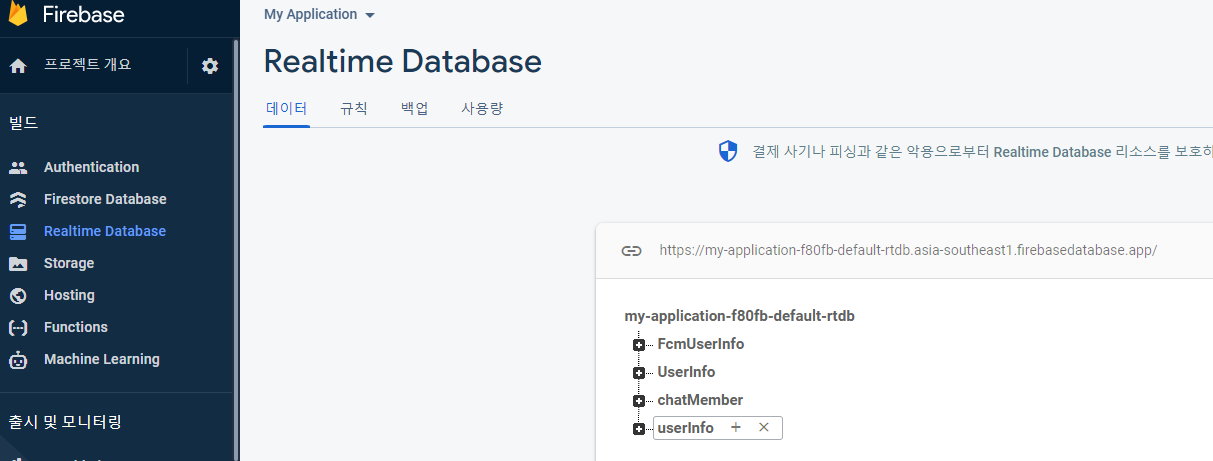 이부분에서 databaseURL 은 어디서 가져 왔는 가 ? firebase의 console 에서 realtime database 을 클릭해 보면 처음 화면에 아래 그림 처럼 https://... 으로 시작하는 URL 이 기술 되어 있으니 그걸 복사해서 붙이면 끝.