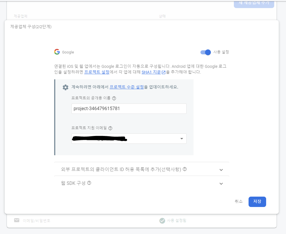 사용 설정을 클릭하면 다음과 같이 프로젝트 이름이 나오고 프로젝트 지원 이메일 설정을 하도록 나온다. 지원 이메일은 내가 사용하는 gmail 계정을 입력하면 된다.