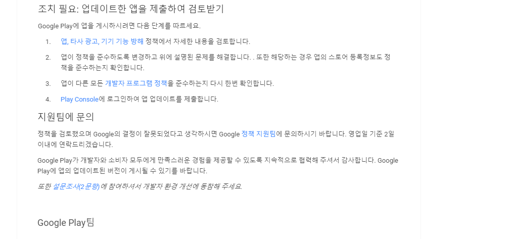 이렇게 해서 수정은 완성된 것 같다. 그래서 이제 다시 playstore 에 다시 등록을 요청 하였다.