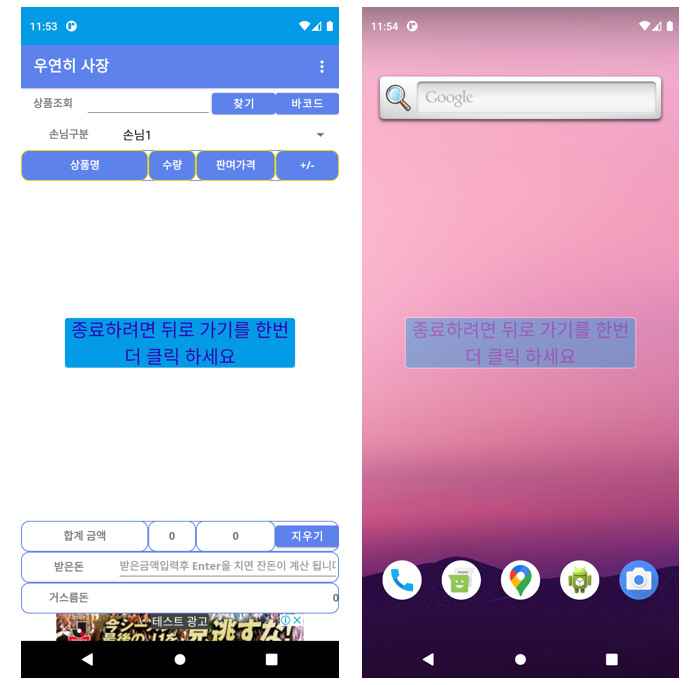 친절하기도 하여라... 앱을 실행했다가 종료하기 위해서 뒤로 가기 버튼을 클릭했을 때, 한번 클릭으로 앱이 종료 되는 것을 막기 위해서 두번 클릭 하라는 안내 문구를 보여 주면서 adsense 을 통해서 광고를 붙였는데, 흠... 그것이 Toast.LENGTH_LONG 을 설정해 두기는 했지만, 저렇게 앱이 종료된 이후에도 Custom Toast 메시지가 남아 있어서 구글에서는 그것을 일부러 저렇게 처리했다고 판단하는 것 같았다.