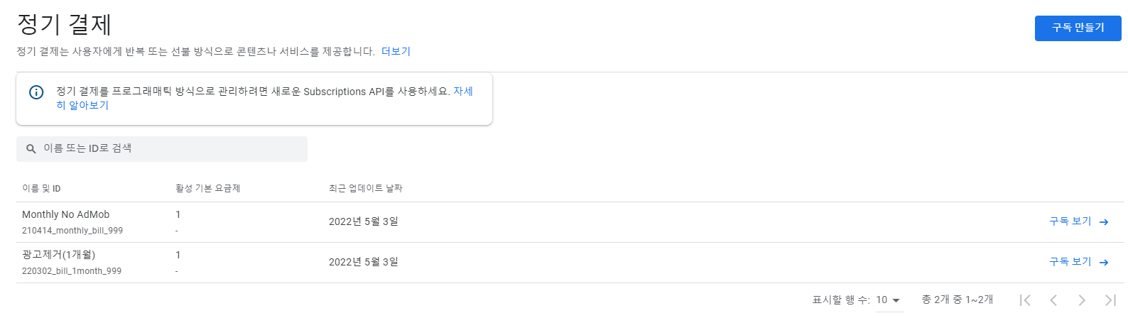 먼저 이전에 등록해서 운영하던 경우를 기준으로 작성하고 있음을 밝혀 둡니다. 이전에 만들었던 앱에 매월 정기 결제를 통해 광고를 제거하는 옵션을 달았던 적이 있습니다.
