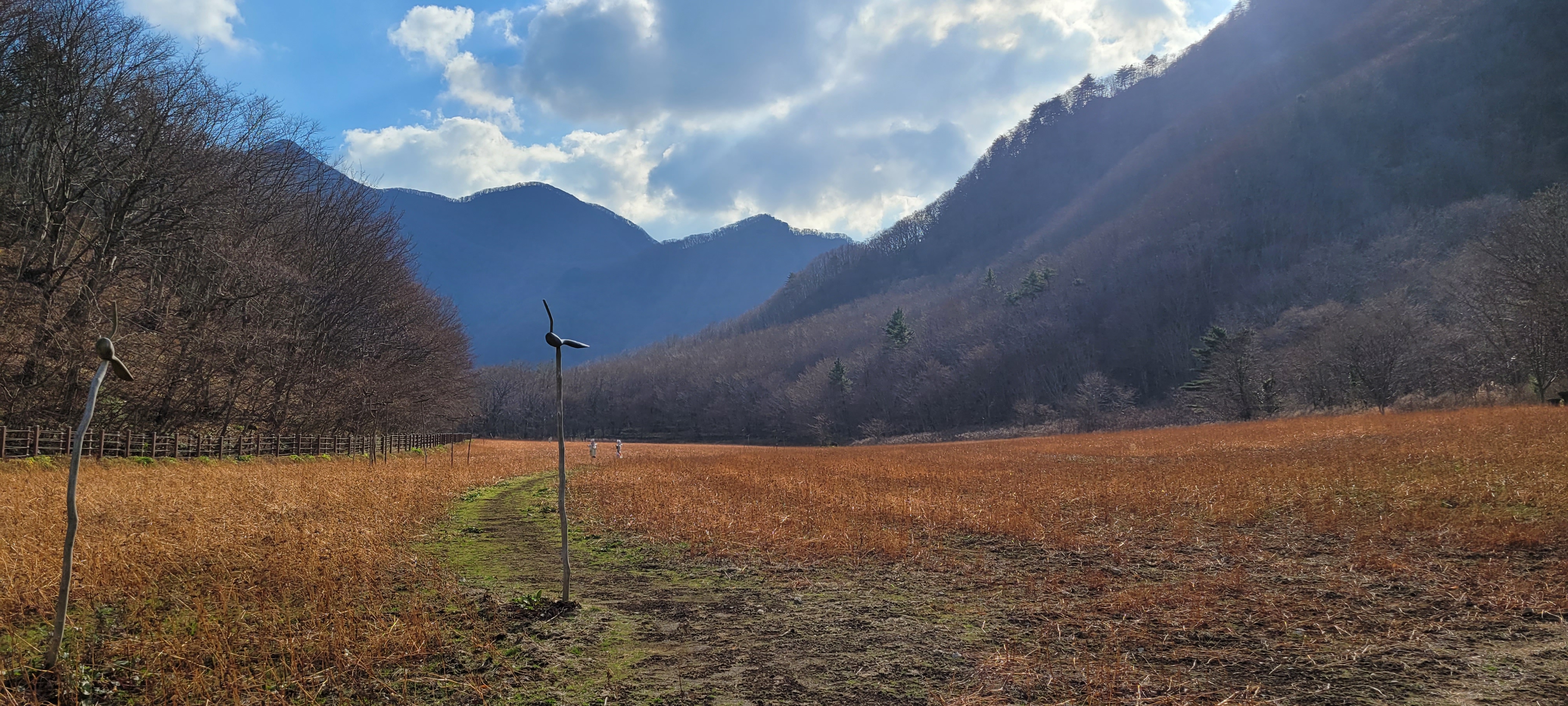 출렁다리 옆으로 펼쳐진 평원(?)입니다. 나리 분지와 또 다른 작은 분지입니다. 이곳에서는 어떤 작물이 자라났는지는 모르겠지만, 중간에 허수아비들이 남아 있어서 약간은 썰렁한 느낌이 들었습니다. 겨울은 찬 기운이 여기저기에 넘쳐 납니다.