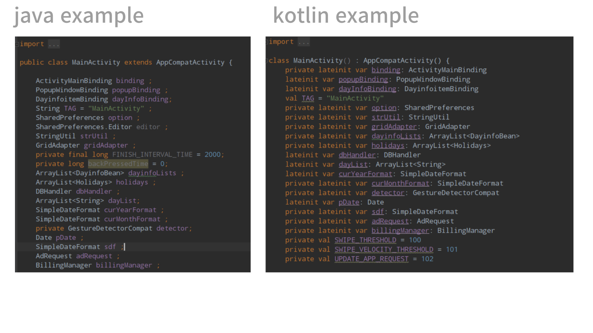 일괄 변환된 후에 해야할 일들이 생깁니다. java 코드에서는 global 변수로 사용하고자 하는 경우 그냥 변수 이름만 선언해 주면 되었던 부분들이 kotlin을 변환하게 되면 그 값을 정해 주는 것에 대해서 설정을 해 주어야 하는 부분들이 생기며 해당 변수를 일괄적으로 null 대입하는 코드로 변환을 해 주시기 때문에 아래 예시들처럼 수정을 해 주어야 하는 부분들이 생깁니다.
